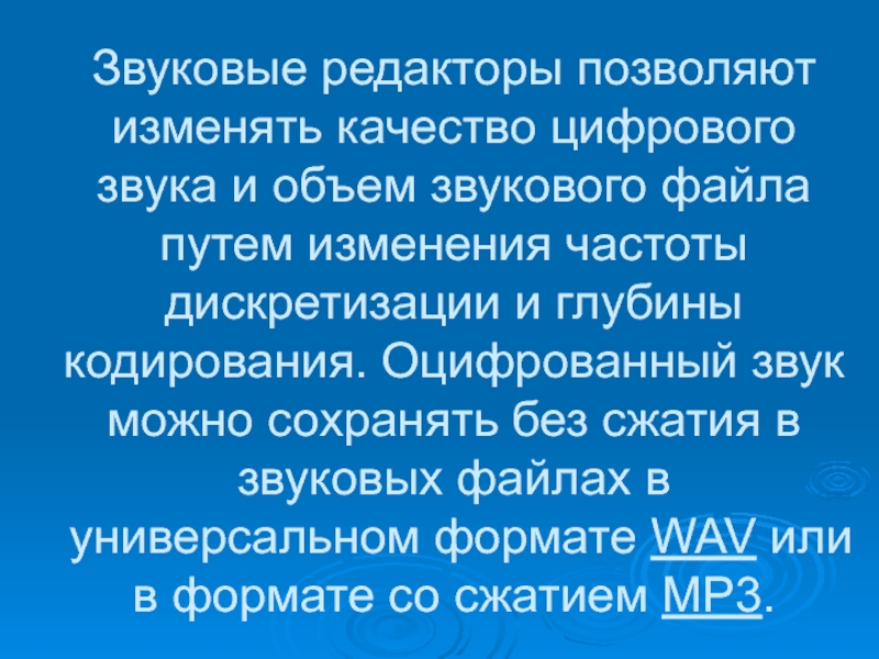 Слайд 26Звуковые редакторы позволяют изменять качество цифрового звука и объем звукового файла