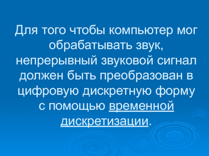 Слайд 10Для того чтобы компьютер мог обрабатывать звук, непрерывный звуковой сигнал должен