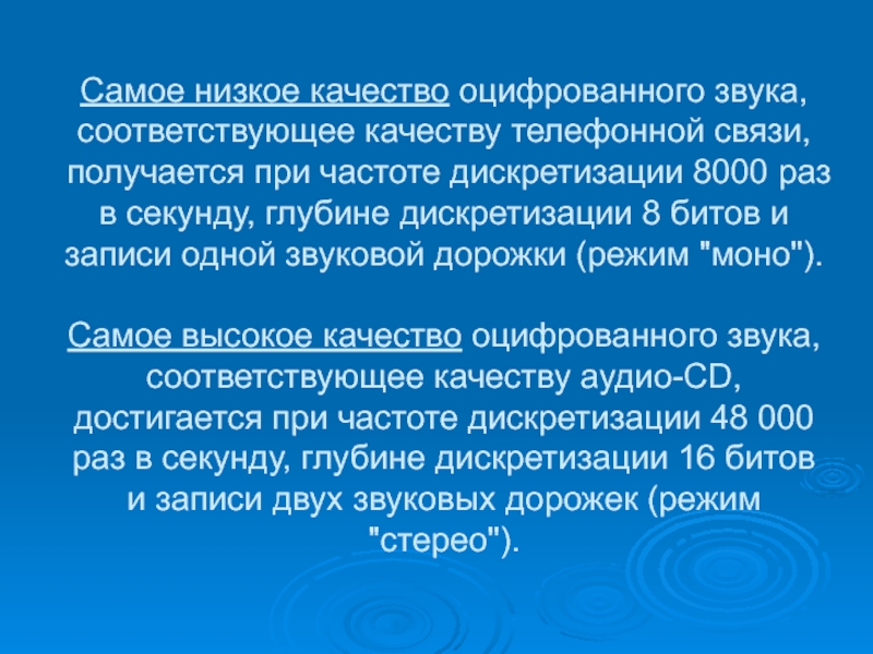 Слайд 22Самое низкое качество оцифрованного звука, соответствующее качеству телефонной связи, получается при