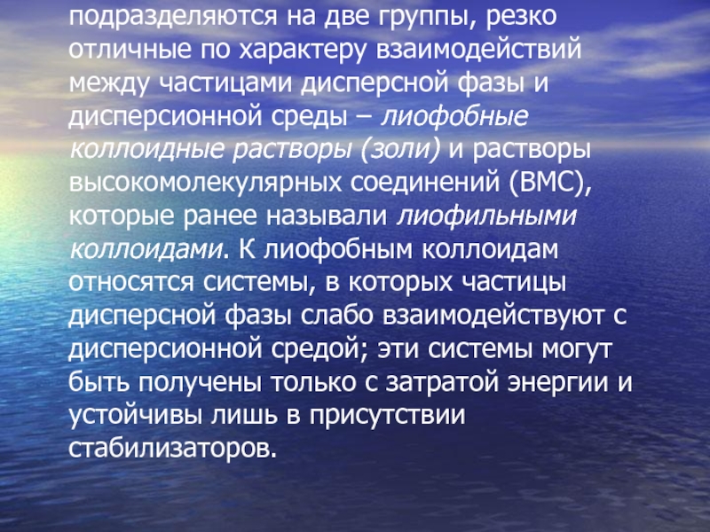 по характеру взаимодействий между частицами дисперсной фазы и дисперсионной среды – лиофобные коллоидные растворы (золи) и растворы высокомолекулярных соединений (ВМС), которые ранее называли лиофильными коллоидами. К лиофобным коллоидам относятся системы, в которых частицы дисперсной фазы слабо взаимодействуют с дисперсионной средой; эти системы могут быть получены только с затратой энергии и устойчивы лишь в присутствии стабилизаторов.