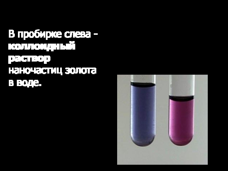 Слайд 17В пробирке слева - коллоидный раствор наночастиц золота в воде.