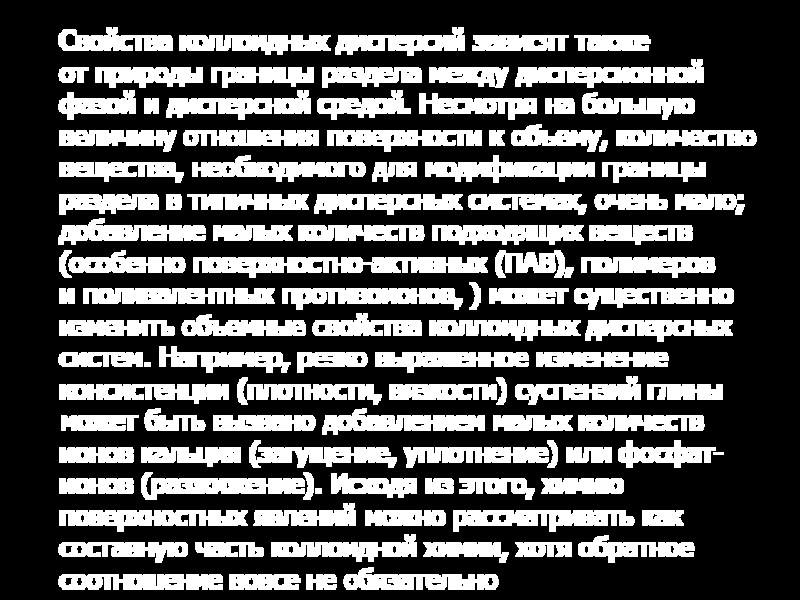 фазой и дисперсной средой. Несмотря на большую величину отношения поверхности к объему, количество вещества, необходимого для модификации границы раздела в типичных дисперсных системах, очень мало; добавление малых количеств подходящих веществ (особенно поверхностно-активных (ПАВ), полимеров и поливалентных противоионов, ) может существенно изменить объемные свойства коллоидных дисперсных систем. Например, резко выраженное изменение консистенции (плотности, вязкости) суспензий глины может быть вызвано добавлением малых количеств ионов кальция (загущение, уплотнение) или фосфат-ионов (разжижение). Исходя из этого, химию поверхностных явлений можно рассматривать как составную часть коллоидной химии, хотя обратное соотношение вовсе не обязательно