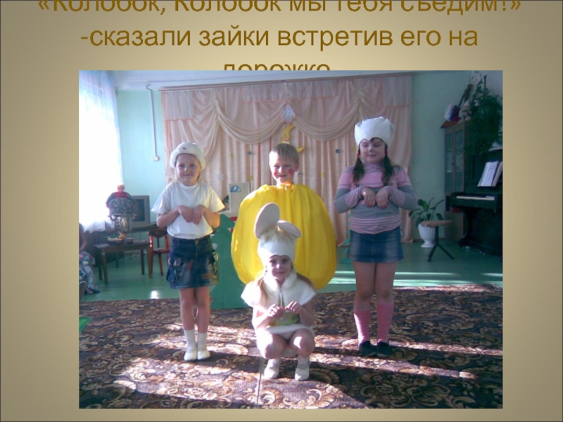 Слайд 8«Колобок, Колобок мы тебя съедим!» -сказали зайки встретив его на дорожке.
