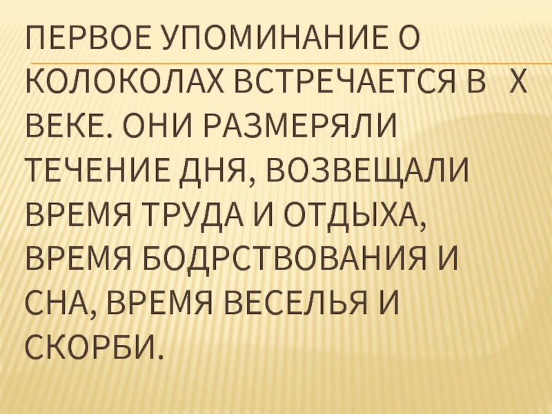 Слайд 9ПЕРВОЕ УПОМИНАНИЕ О КОЛОКОЛАХ ВСТРЕЧАЕТСЯ В X ВЕКЕ. ОНИ РАЗМЕРЯЛИ