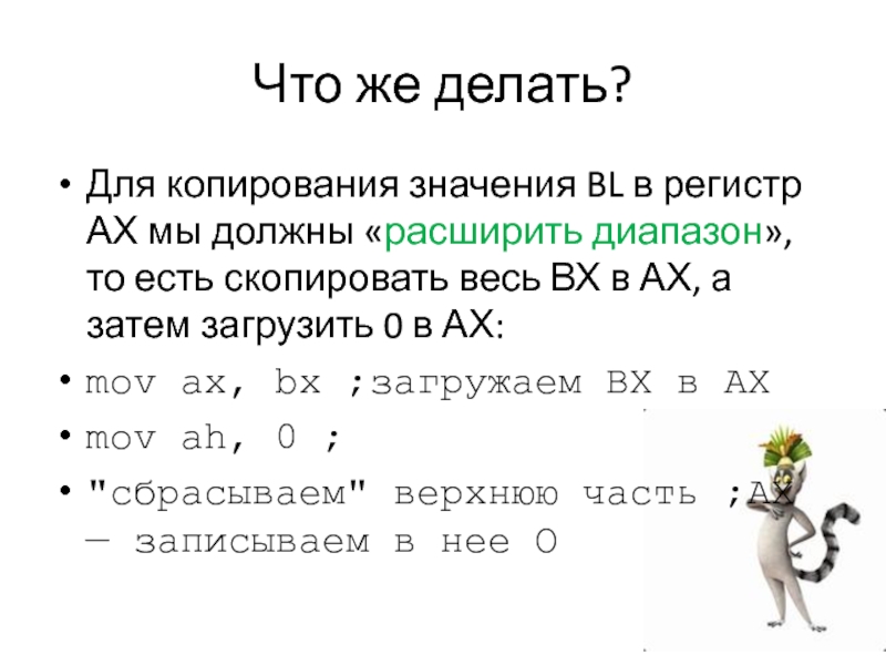 «расширить диапазон», то есть скопировать весь ВХ в АХ, а затем загрузить 0 в АХ: