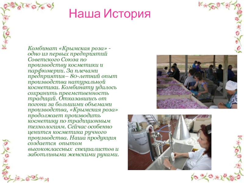 первых предприятий Советского Союза по производству косметики и парфюмерии. За плечами предприятия– 80-летний опыт производства натуральной косметики. Комбинату удалось сохранить преемственность традиций. Отказавшись от погони за большими объемами производства, «Крымская роза» продолжает производить косметику по традиционным технологиям. Сейчас особенно ценится косметика ручного производства. Наша продукция создается опытом высококлассных специалистов и заботливыми женскими руками.