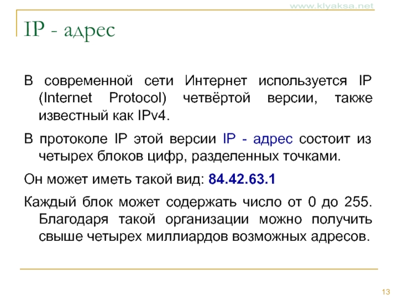 В протоколе IP этой версии IP - адрес состоит из четырех блоков цифр, разделенных точками.