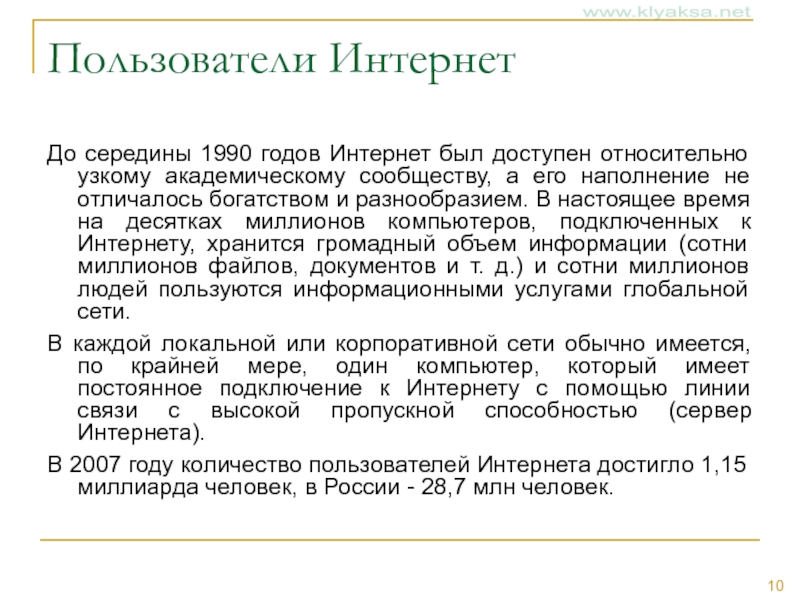 Основу, «каркас» Интернета составляют более ста миллионов серверов, постоянно подключенных к сети. К серверам Интернета могут подключаться с помощью локальных сетей или коммутируемых телефонных линий сотни миллионов пользователей сети.
