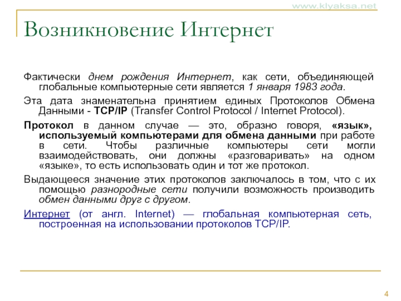 Фактически днем рождения Интернет, как сети, объединяющей глобальные компьютерные сети