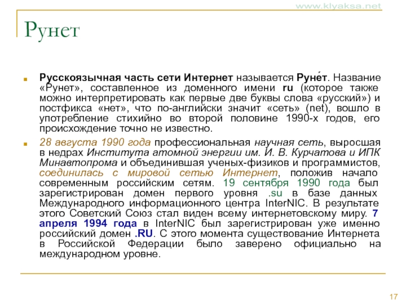 Русскоязычная часть сети Интернет называется Руне́т. Название «Рунет», составленное из доменного