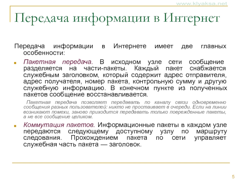 передача. В исходном узле сети сообщение разделяется на части-пакеты. Каждый пакет снабжается служебным заголовком, который содержит адрес отправителя, адрес получателя, номер пакета, контрольную сумму и другую служебную информацию. В конечном пункте из полученных пакетов сообщение восстанавливается.