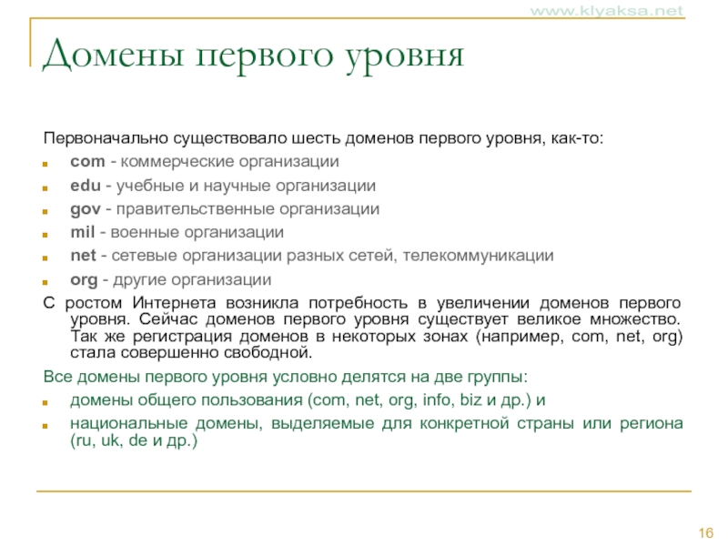Первоначально существовало шесть доменов первого уровня, как-то: