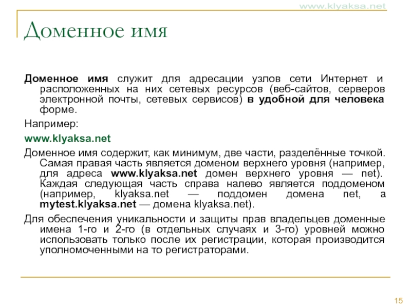 Доменное имя содержит, как минимум, две части, разделённые точкой. Самая правая часть является доменом верхнего уровня (например, для адреса www.klyaksa.net домен верхнего уровня — net). Каждая следующая часть справа налево является поддоменом (например, klyaksa.net — поддомен домена net, а mytest.klyaksa.net — домена klyaksa.net).