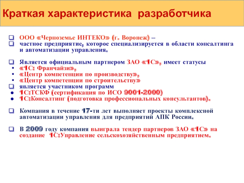 В 2009 году компания выиграла тендер партнеров ЗАО «1С» на создание 1С:Управление сельскохозяйственным предприятием.