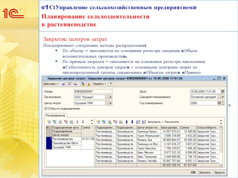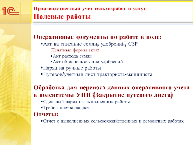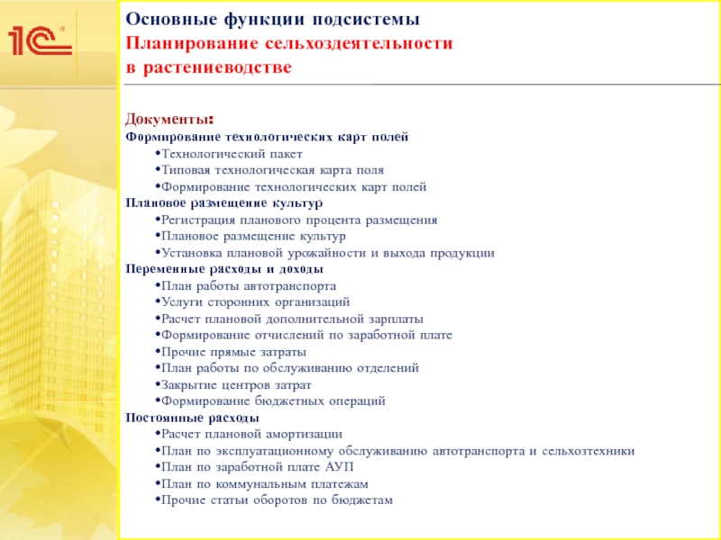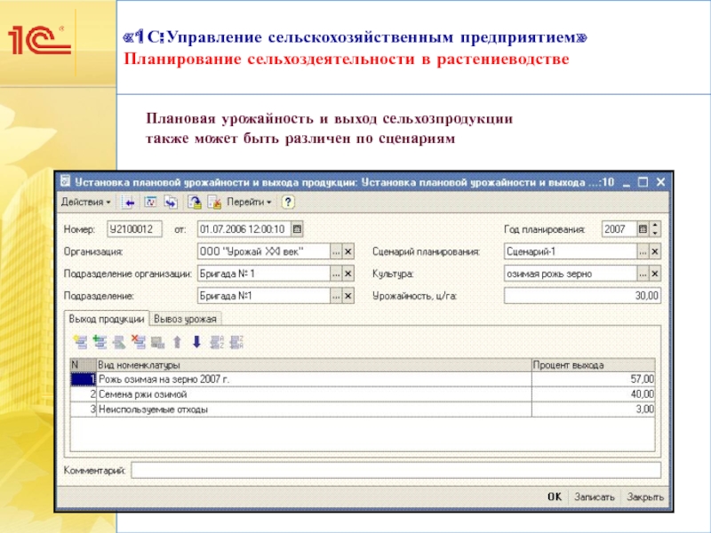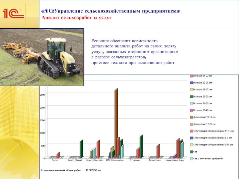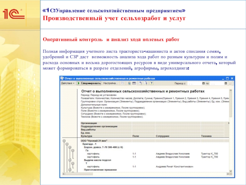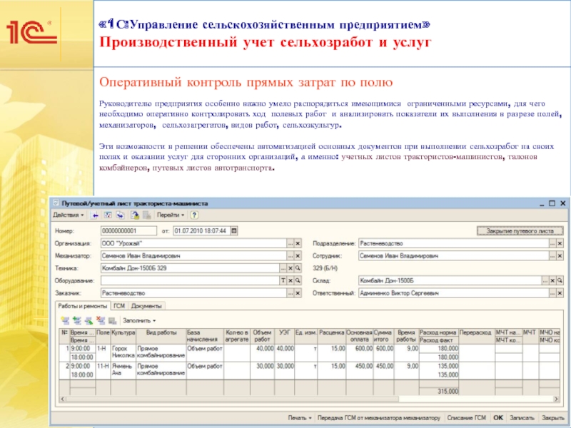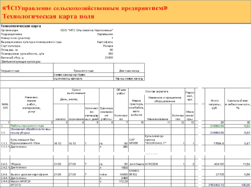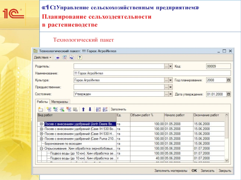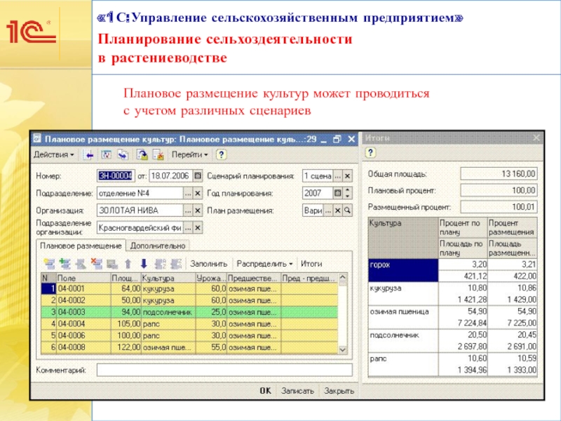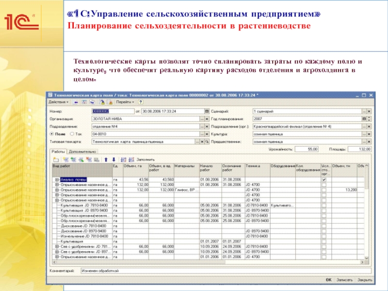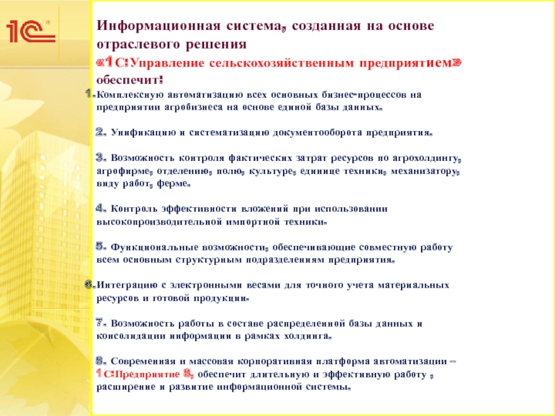 Отраслевое решение позволяет организовать единую информационную систему для управления всеми аспектами деятельности агропредприятия а именно:
