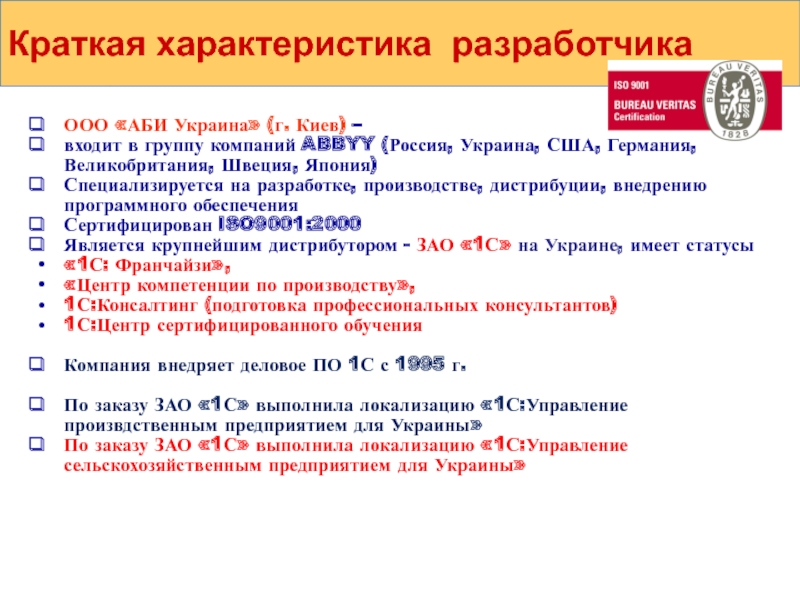 По заказу ЗАО «1С» выполнила локализацию «1С:Управление произвдственным предприятием для Украины»