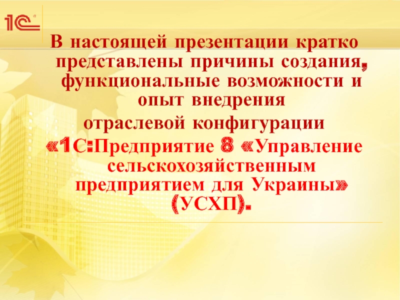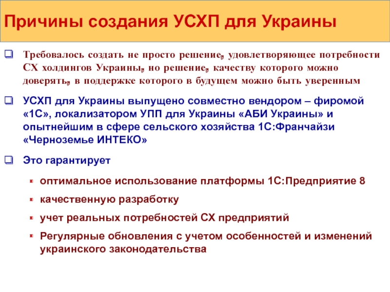 УСХП для Украины выпущено совместно вендором – фиромой «1С», локализатором УПП для Украины «АБИ Украины» и опытнейшим в сфере сельского хозяйства 1С:Франчайзи «Черноземье ИНТЕКО»