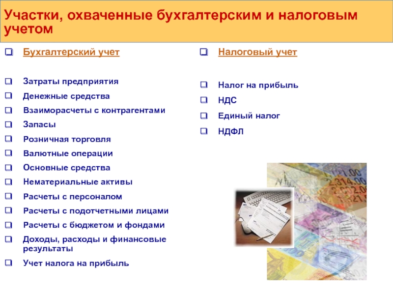 Слайд 101Участки, охваченные бухгалтерским и налоговым учетом