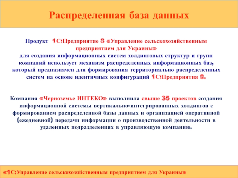 для создания информационных систем холдинговых структур и групп компаний использует механизм распределенных информационных баз, который предназначен для формирования территориально распределенных систем на основе идентичных конфигураций 1С:Предприятия 8.