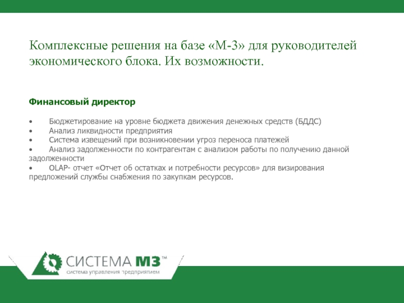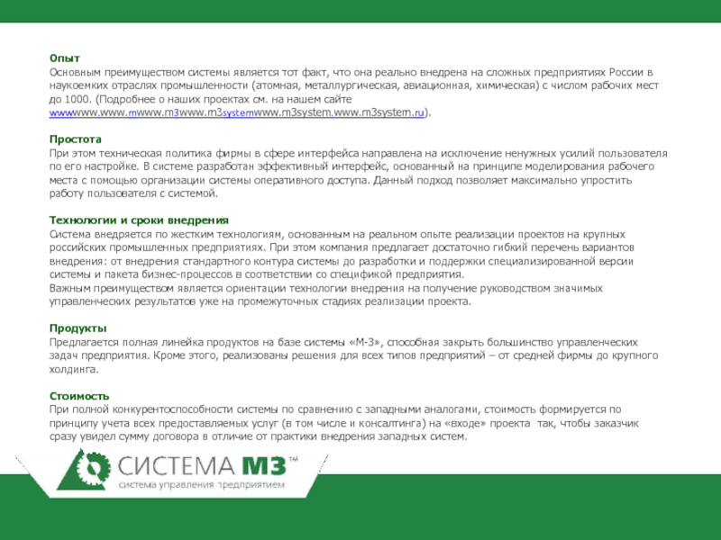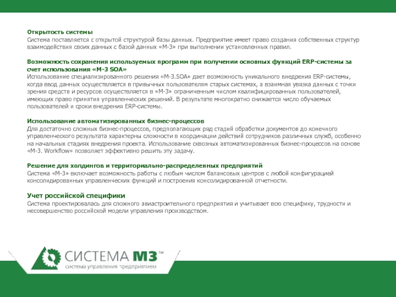 Возможность параллельного использования внедренного на предприятии ПО и модулей системы «М-3»;