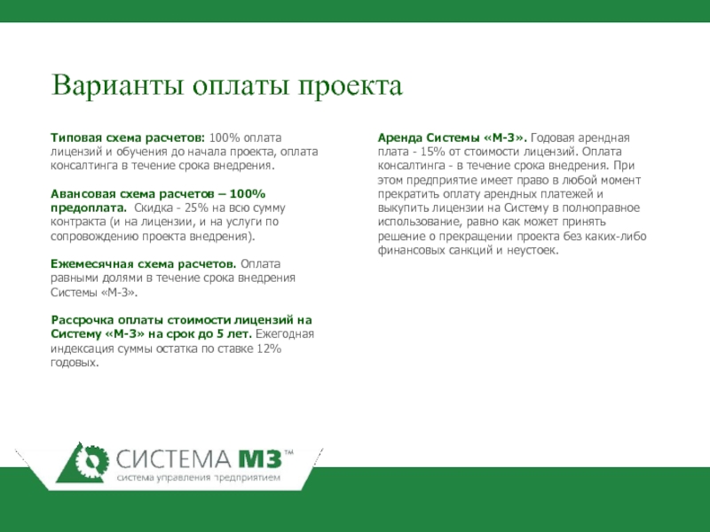 Аренда Системы «М-3». Годовая арендная плата - 15% от стоимости лицензий. Оплата консалтинга - в течение срока внедрения. При этом предприятие имеет право в любой момент прекратить оплату арендных платежей и выкупить лицензии на Систему в полноправное использование, равно как может принять решение о прекращении проекта без каких-либо финансовых санкций и неустоек.