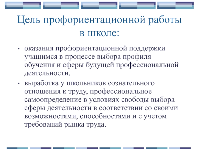 выработка у школьников сознательного отношения к труду, профессиональное самоопределение в условиях свободы выбора сферы деятельности в соответствии со своими возможностями, способностями и с учетом требований рынка труда.
