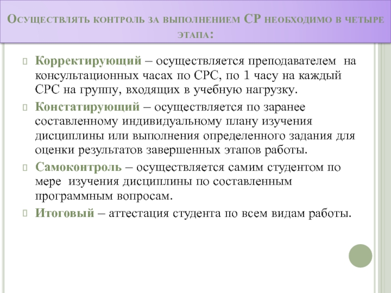 Слайд 49Осуществлять контроль за выполнением СР необходимо в четыре этапа: