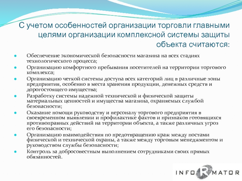 Оказание помощи руководству и персоналу торгового предприятия в своевременном выявлении и профилактике фактов и признаков готовящихся противоправных действий на территории объекта, а также различных угроз его безопасности;