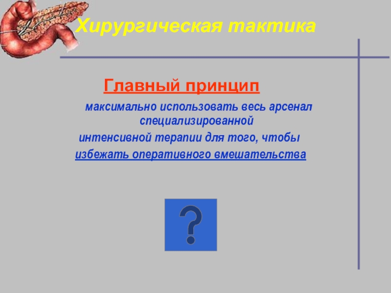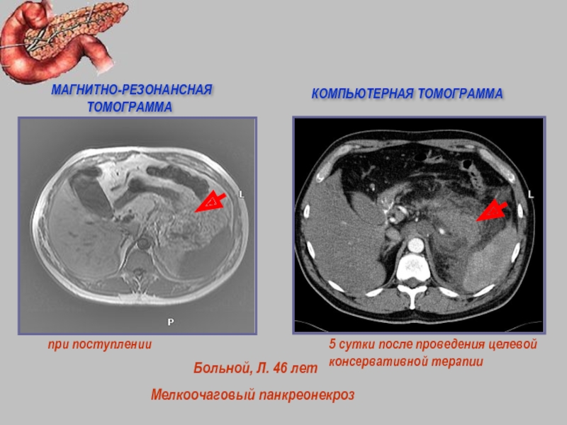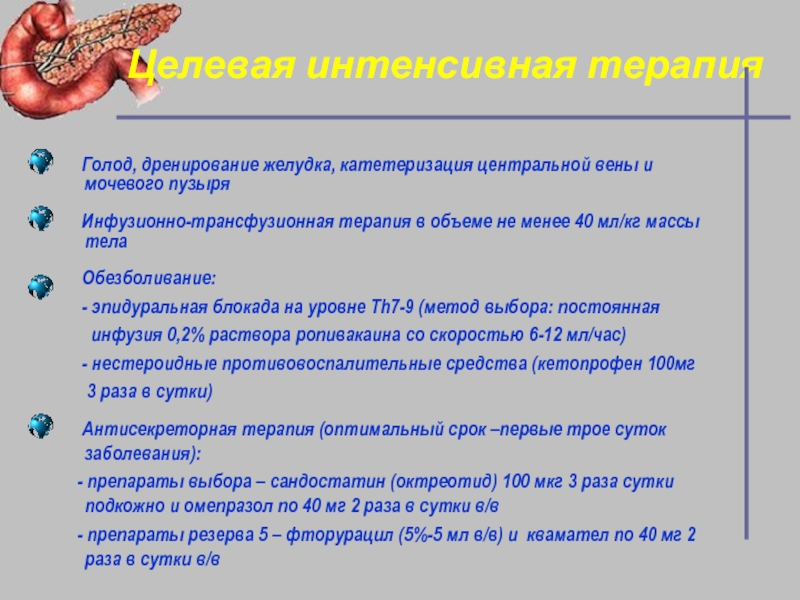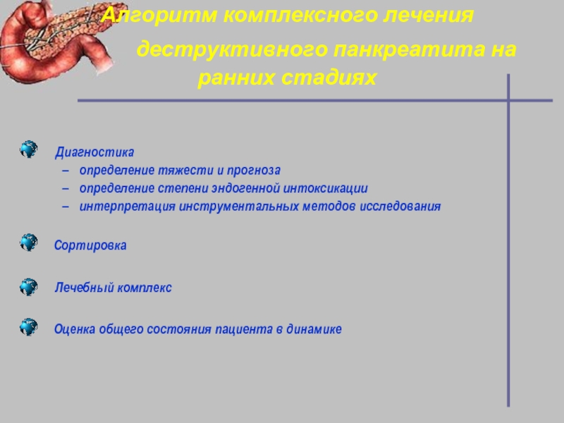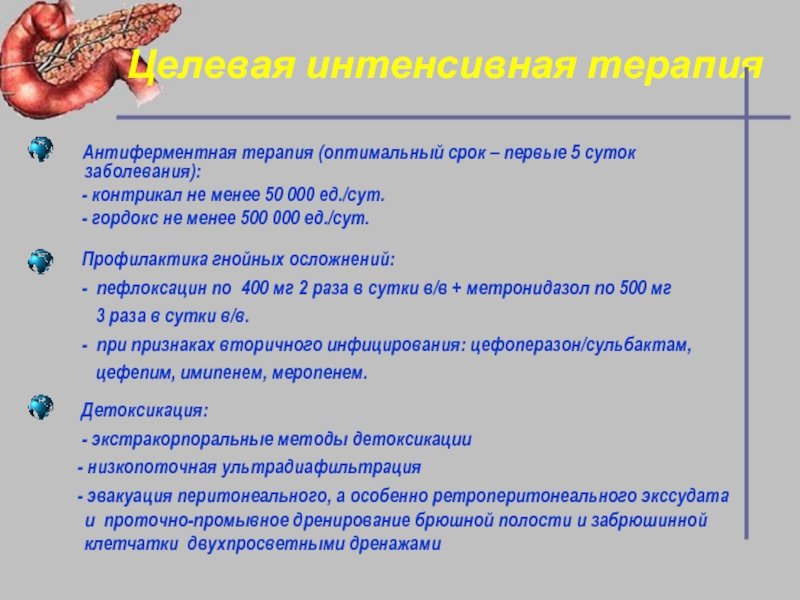 При деструктивном панкреатите на ранней стадии развития проведение интенсивной целевой терапии является оптимальным. При выявлении панкреатогенного ферментативного перитонита методом выбора является лечебно-диагностическая лапароскопия, которая в сочетании с консервативной терапией приводит к абортивному течению заболевания. В случае билиарного характера острого интерстициального панкреатита комплекс терапевтических мероприятий и эндоскопических методов направлен на экстренное устранение этиопатогенетического билиарного фактора