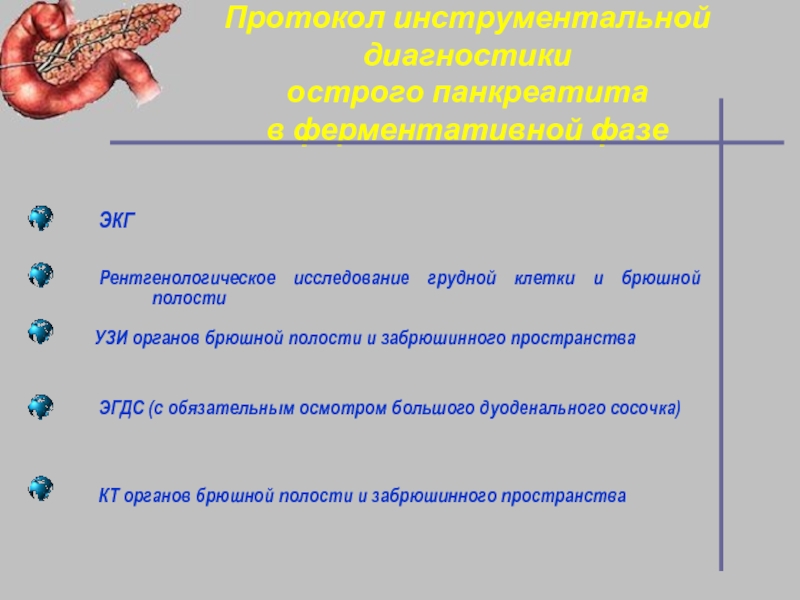 подтверждение диагноза острого панкреатита с оценкой его формы (исключение других заболеваний брюшной полости, прежде всего острой хирургической патологии)