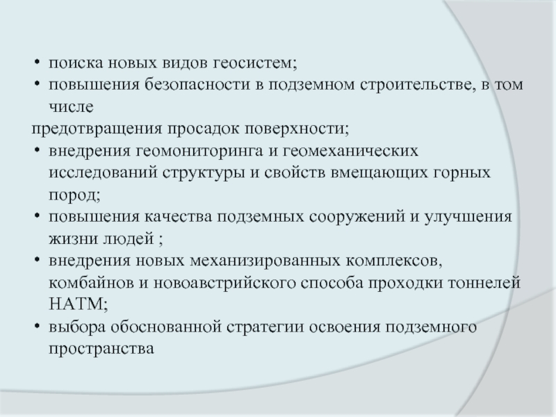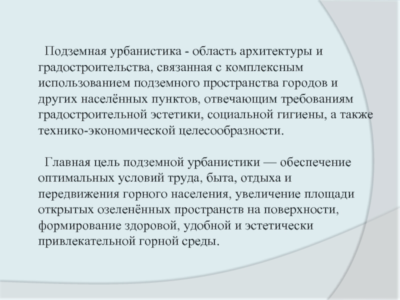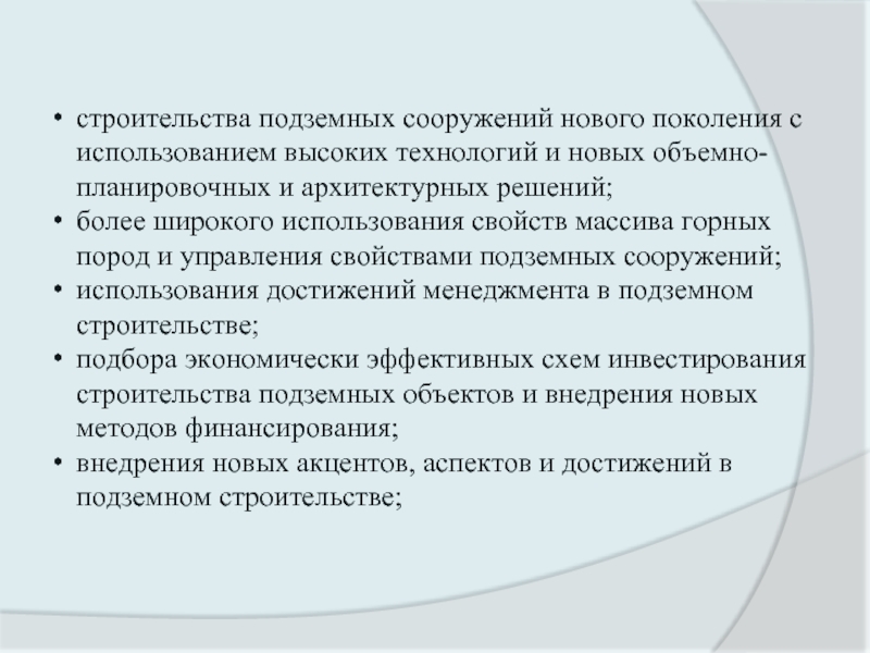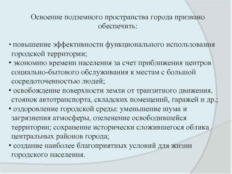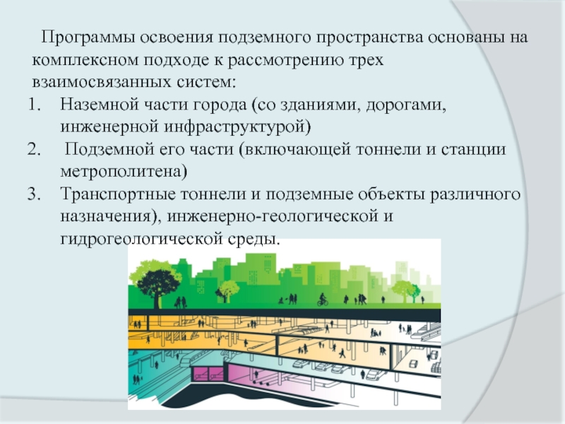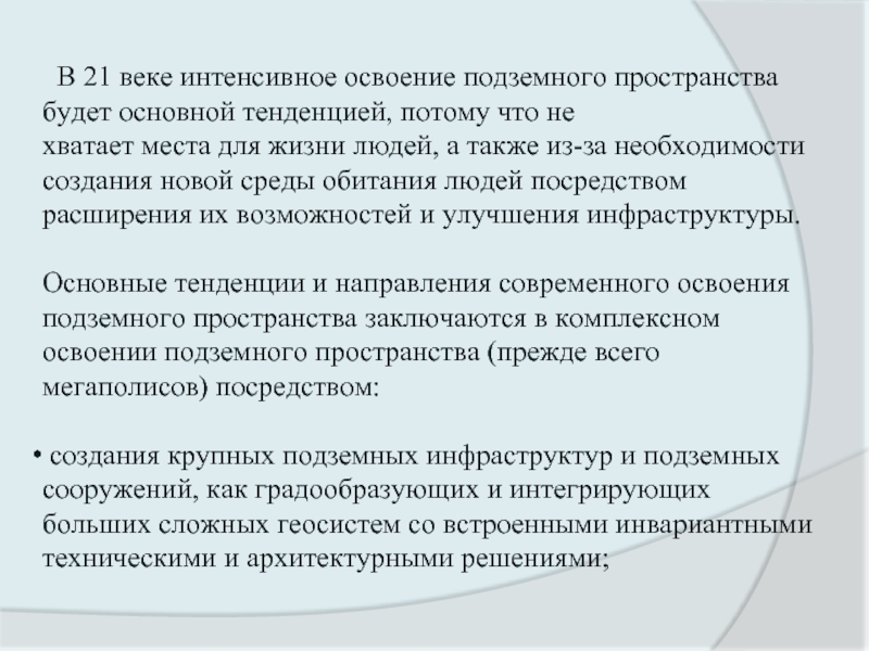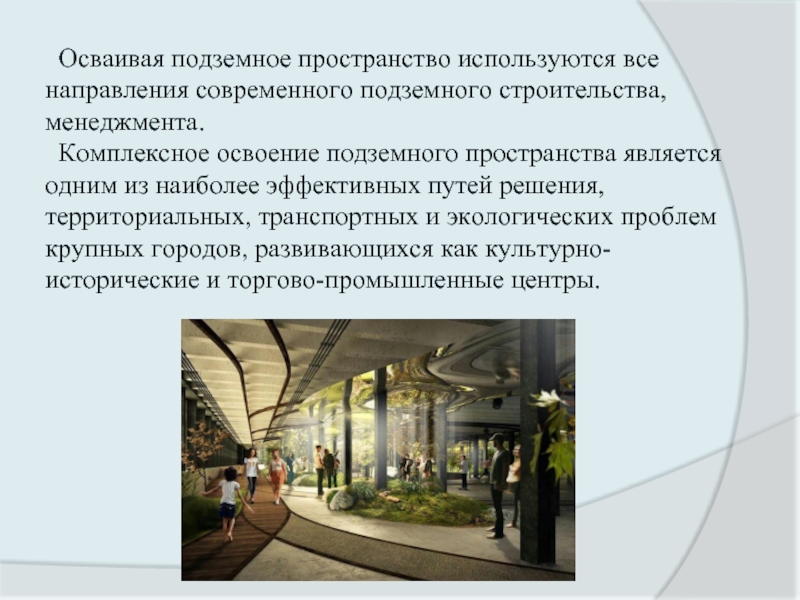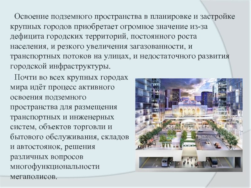 Почти во всех крупных городах мира идёт процесс активного освоения подземного пространства для размещения транспортных и инженерных систем, объектов торговли и бытового обслуживания, складов и автостоянок, решения различных вопросов многофункциональности мегаполисов.