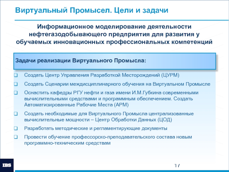 Проекты по развитию ИТ-инфраструктуры; создание специализированного ИТ-инструментария для подготовки специалистов по добычи нефти и разработки месторождения (РГУ нефти и газа имени И.М. Губкина)