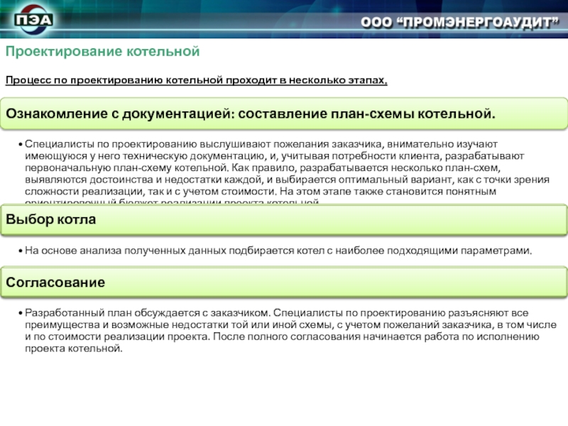 Разработанный план обсуждается с заказчиком. Специалисты по проектированию разъясняют все преимущества и возможные недостатки той или иной схемы, с учетом пожеланий заказчика, в том числе и по стоимости реализации проекта. После полного согласования начинается работа по исполнению проекта котельной.