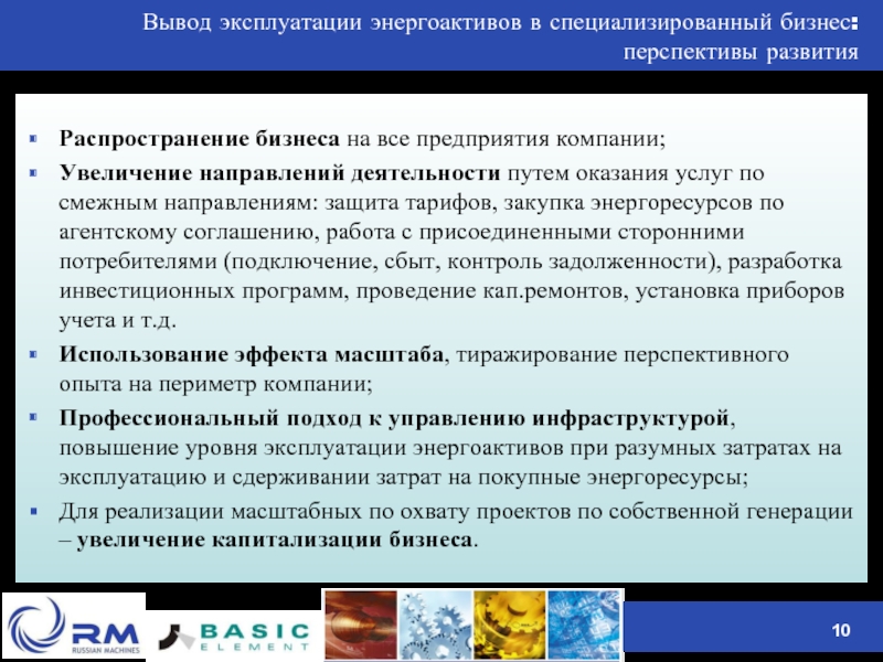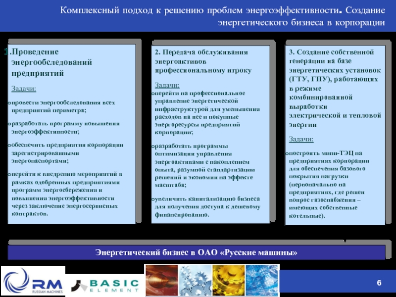 перейти на профессиональное управление энергетической инфраструктурой для уменьшения расходов на нее и покупные энергоресурсы предприятий корпорации;