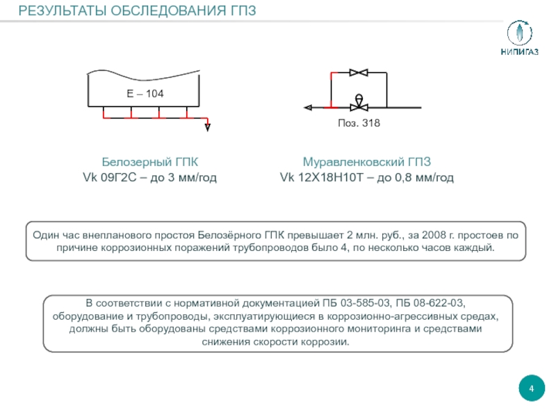 Один час внепланового простоя Белозёрного ГПК превышает 2 млн. руб., за 2008 г. простоев по причине коррозионных поражений трубопроводов было 4, по несколько часов каждый.
