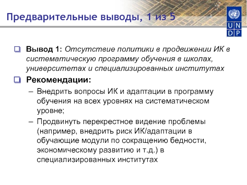 Продвинуть перекрестное видение проблемы (например, внедрить риск ИК/адаптации в обучающие модули по сокращению бедности, экономическому развитию и т.д.) в специализированных институтах