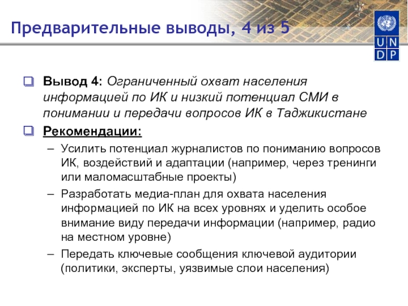 Усилить потенциал журналистов по пониманию вопросов ИК, воздействий и адаптации (например, через тренинги или маломасштабные проекты)