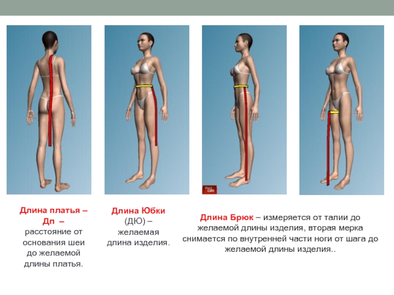 Длина Брюк – измеряется от талии до желаемой длины изделия, вторая мерка снимается по внутренней части ноги от шага до желаемой длины изделия..