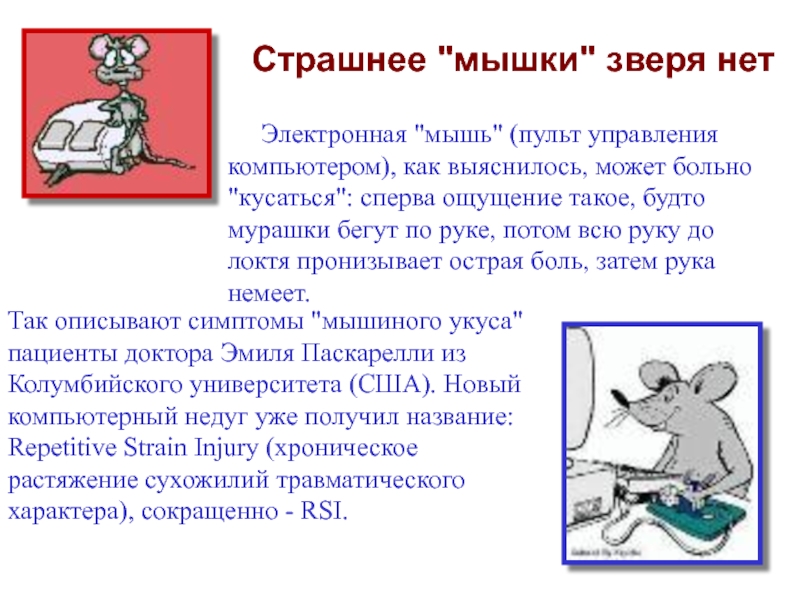 Так описывают симптомы "мышиного укуса" пациенты доктора Эмиля Паскарелли из Колумбийского университета (США). Новый компьютерный недуг уже получил название: Repetitive Strain Injury (хроническое растяжение сухожилий травматического характера), сокращенно - RSI.