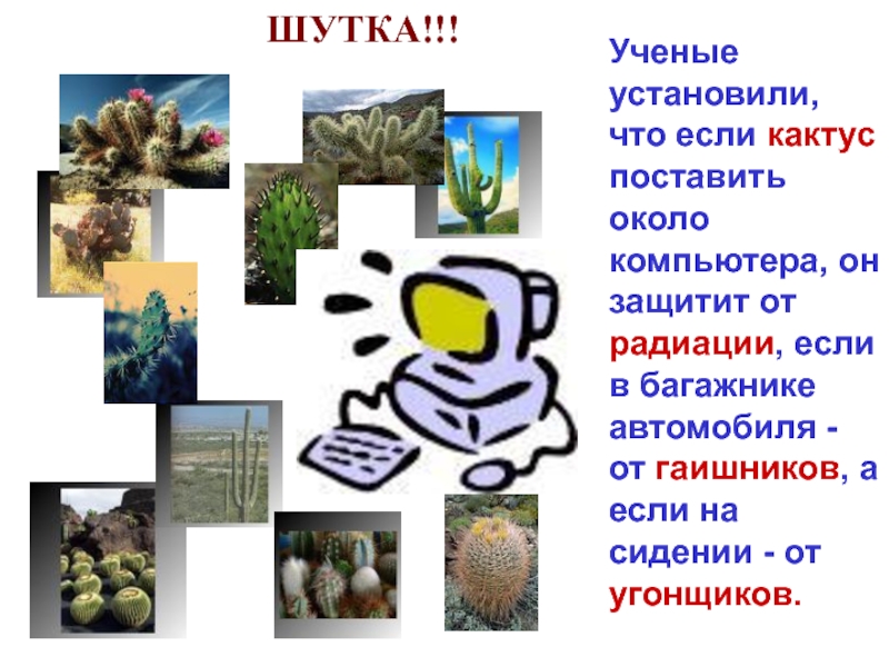 Слайд 40Ученые установили, что если кактус поставить около компьютера, он защитит от