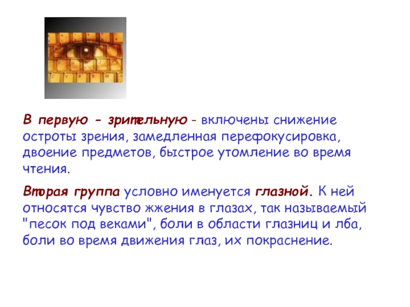 пользователей. Он появляется у всех, кто регулярно проводит у экрана компьютера более 6 часов в день. Симптомы этого заболевания можно поделить на две группы.