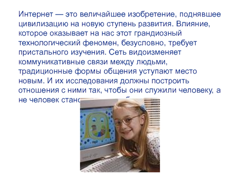 Влияние, которое оказывает на нас этот грандиозный технологический феномен, безусловно, требует пристального изучения. Сеть видоизменяет коммуникативные связи между людьми, традиционные формы общения уступают место новым. И их исследования должны построить отношения с ними так, чтобы они служили человеку, а не человек становился их рабом.