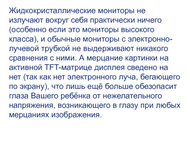 Слайд 10Жидкокристаллические мониторы не излучают вокруг себя практически ничего (особенно если это