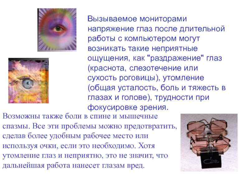 Возможны также боли в спине и мышечные спазмы. Все эти проблемы можно предотвратить, сделав более удобным рабочее место или используя очки, если это необходимо. Хотя утомление глаз и неприятно, это не значит, что дальнейшая работа нанесет глазам вред.