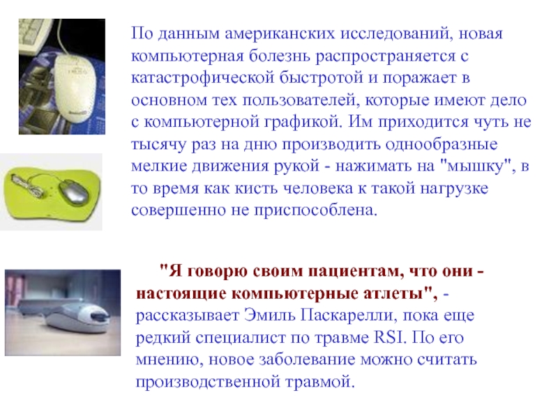 атлеты", - рассказывает Эмиль Паскарелли, пока еще редкий специалист по травме RSI. По его мнению, новое заболевание можно считать производственной травмой.