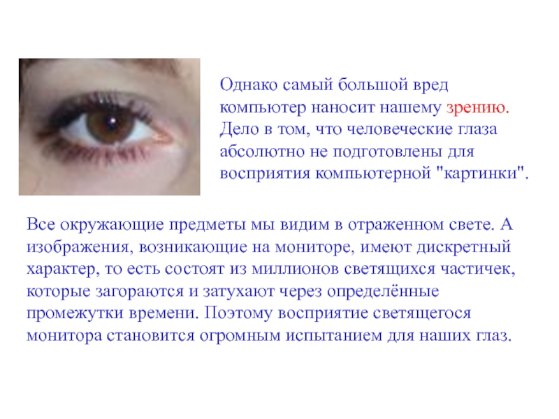 Однако самый большой вред компьютер наносит нашему зрению. Дело в том, что человеческие глаза абсолютно не подготовлены для восприятия компьютерной "картинки".
