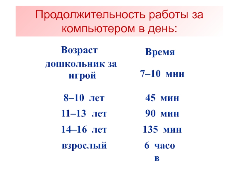 Продолжительность непрерывной работы за компьютером: