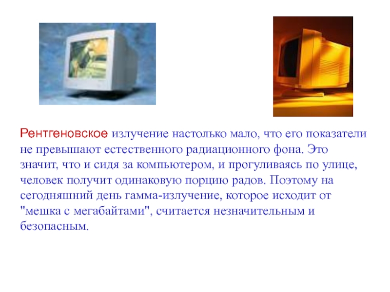 фона. Это значит, что и сидя за компьютером, и прогуливаясь по улице, человек получит одинаковую порцию радов. Поэтому на сегодняшний день гамма-излучение, которое исходит от "мешка с мегабайтами", считается незначительным и безопасным.