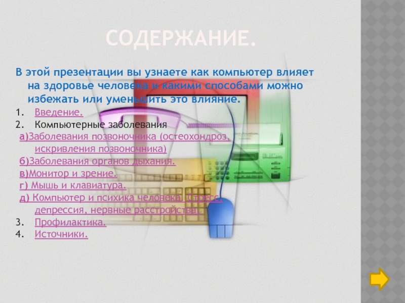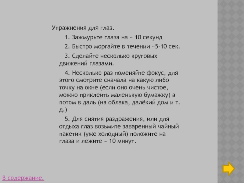 Работа за компьютером предполагает переработку большого массива информации и постоянную концентрацию внимания, поэтому при длительной работе за компьютером нередко развивается умственная усталость и нарушение внимания.