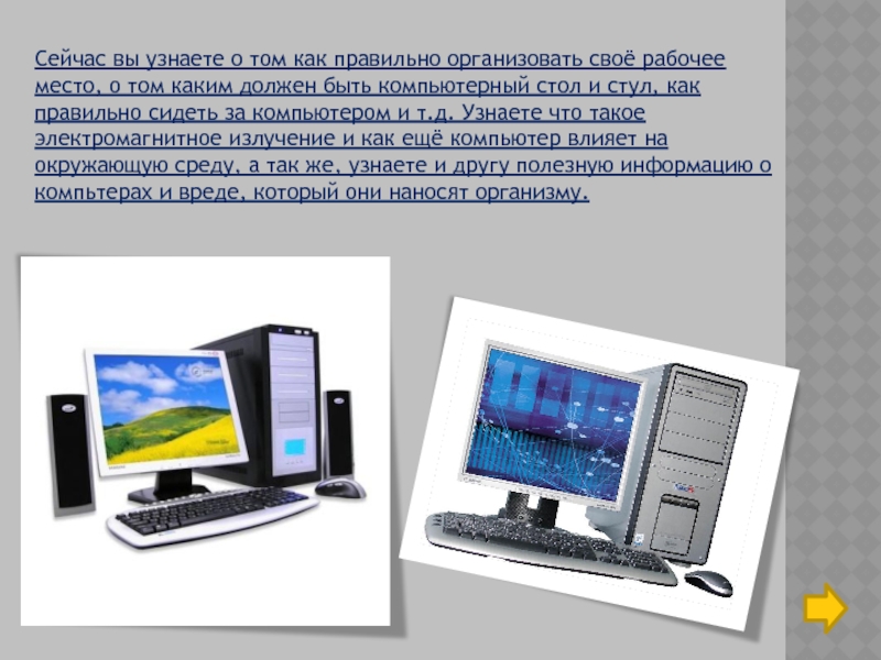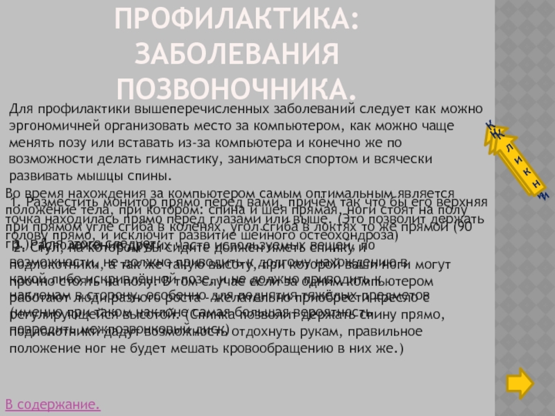 1. Разместить монитор прямо перед вами, причём так что бы его верхняя точка находилась прямо перед глазами или выше. (Это позволит держать голову прямо, и исключит развитие шейного остеохондроза)